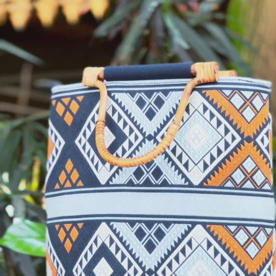 The octagonal flower, a totem praised by the Dai ethnic people in China as the "flower of unity", is white and blue in color, blooming on the dense patterns of brocade. It is as white as the first snow, and is the Dai ethnic people's hope for a pure life. The pattern is dyed by using natural plants, eco-friendly. Handle is made of Bamboo.