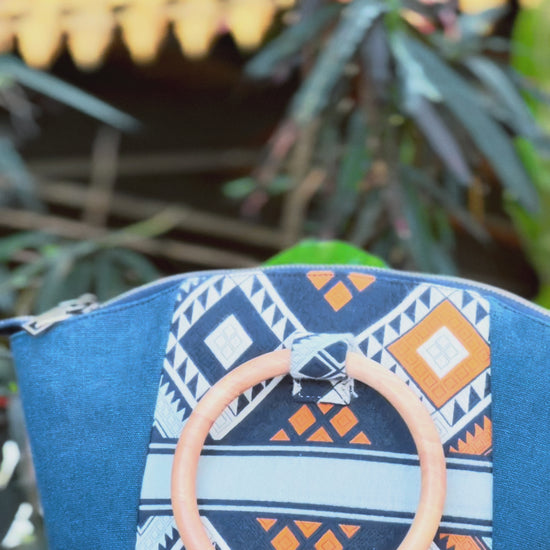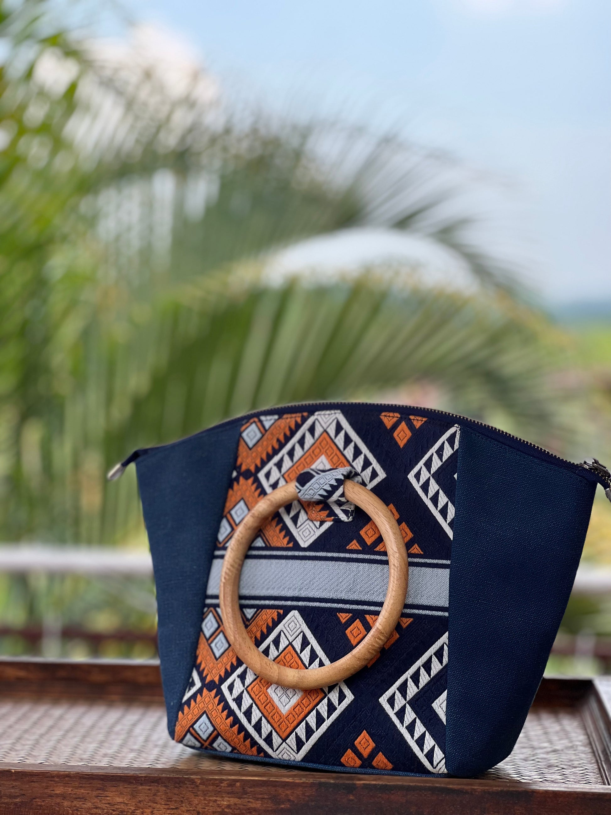 Main body in cotton, natural dyed by plants, eco-friendly; handle: bamboo