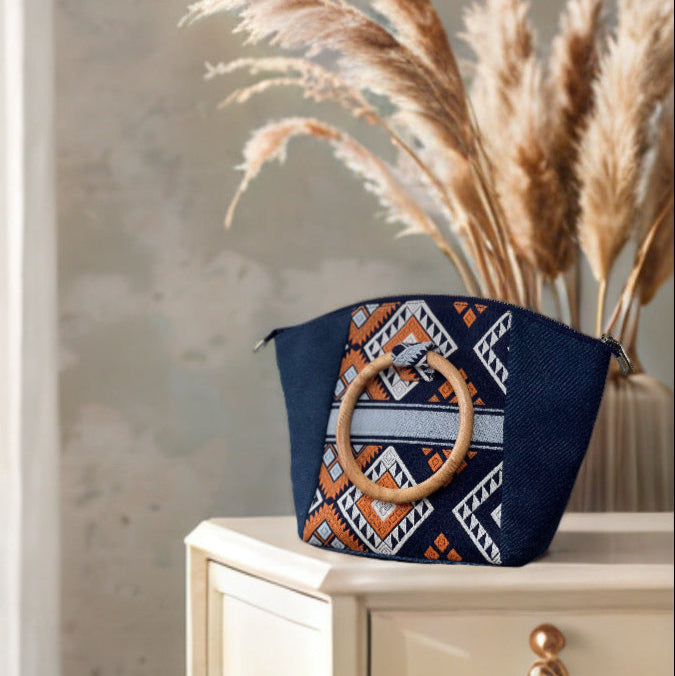 Handmade Natural Plant Dyed Cotton Briefcase with Octagonal Flower Pattern, Unique Pattern Handbag, Bamboo Handle Bag for MacBook 13"