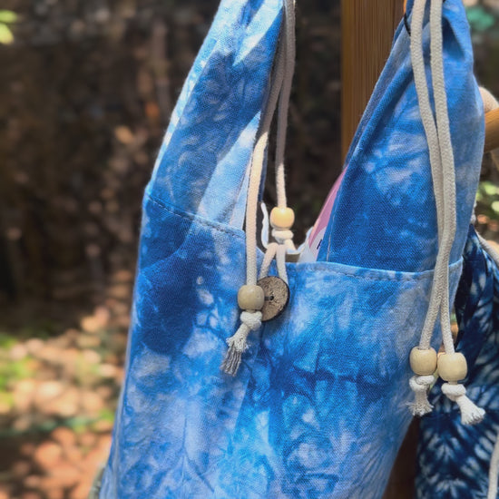 Tie Dye Linen Handbag Pouch with Bamboo Base, Top Handle Bag with Buckle Closure