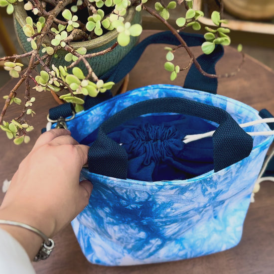 unique tie dye pattern on each piece, straw handbag and crossbody bag