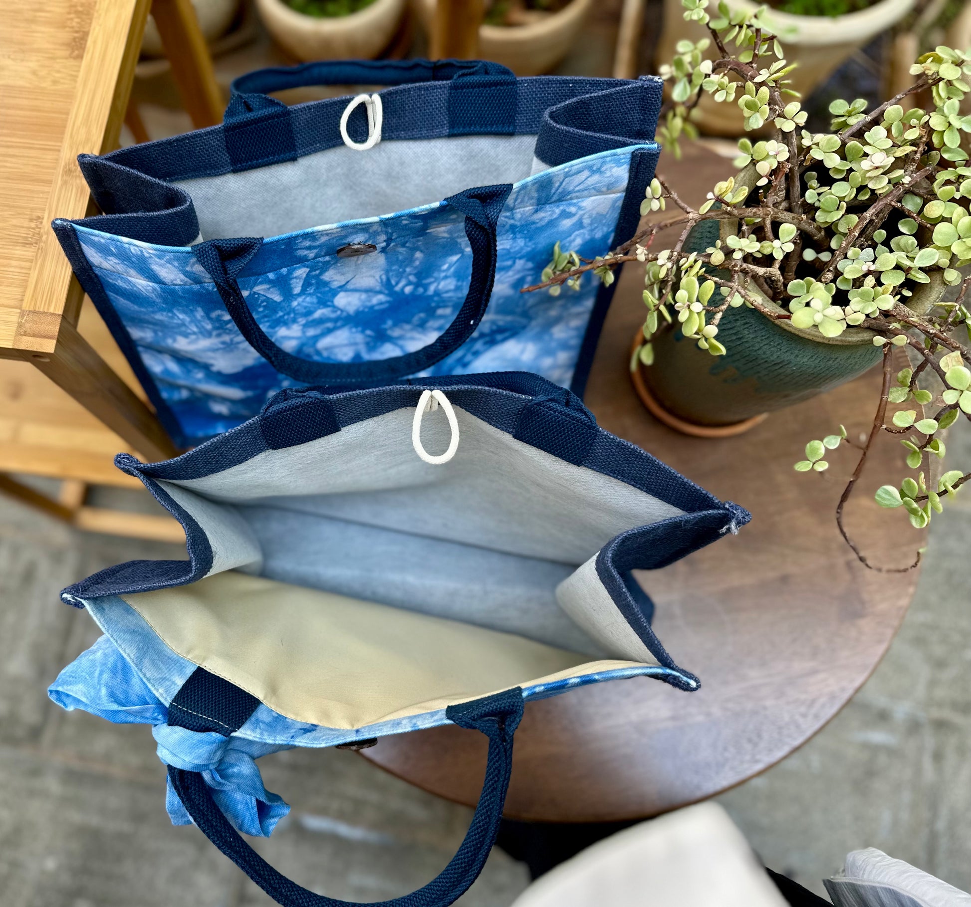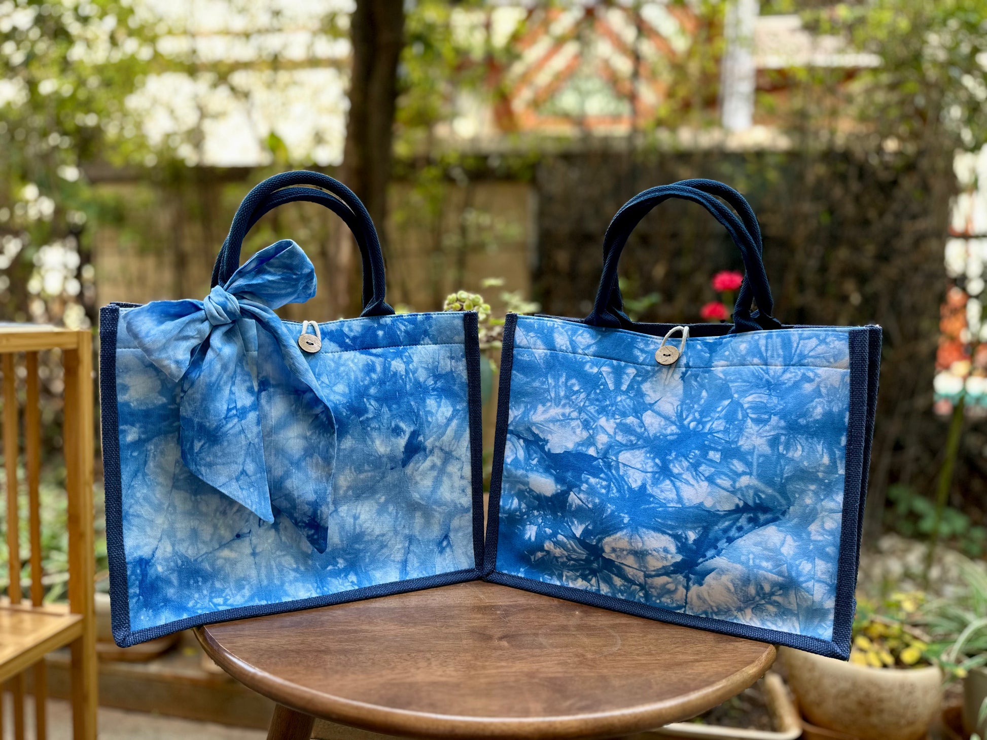unique tie dye pattern on each piece, handmade top handle linen handbag